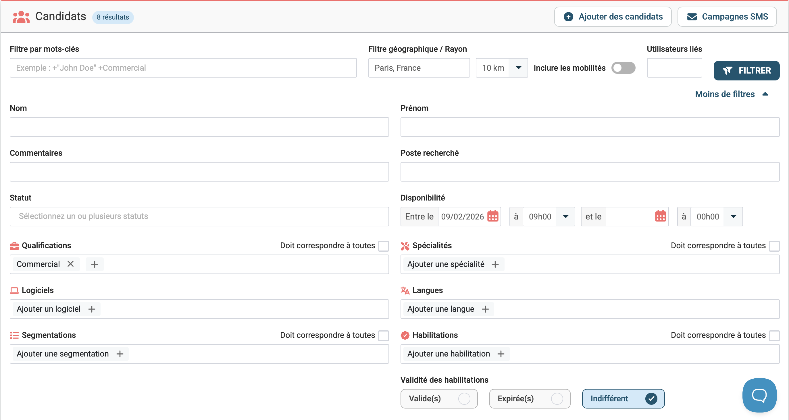 Avant l’envoi d’une campagne SMS, vous pouvez cibler précisément les destinataires grâce à l’onglet Filtrer 🔎 De nombreux critères sont disponibles afin d’affiner votre sélection : prénom, poste, statut, disponibilité, qualifications, logiciels ou encore informations plus spécifiques comme des mots-clés ou certains éléments du profil candidat 📊.