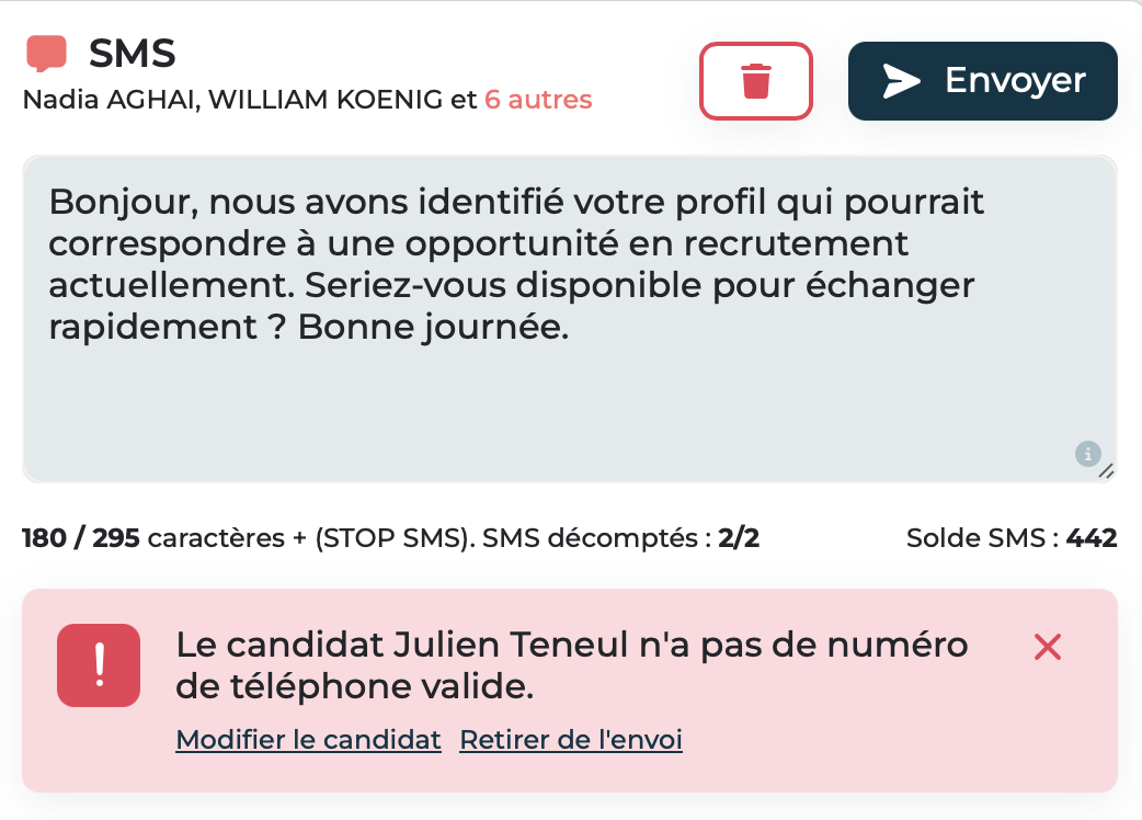 Le système signale également les candidats ne disposant pas d’un numéro valide 📱. Vous pouvez les retirer immédiatement de l’envoi afin d’éviter tout échec, sans avoir à recommencer la campagne.