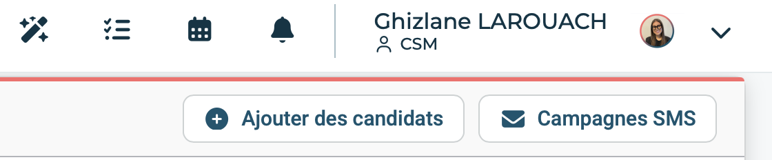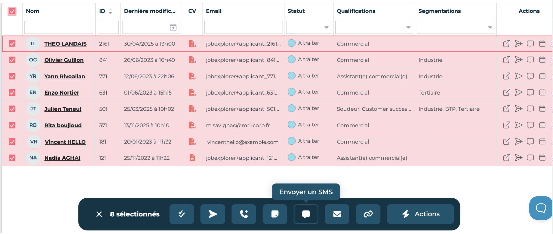 👉 Sélection groupée : cochez plusieurs candidats (ou tous) afin de lancer une campagne SMS plus large. Un bandeau d’actions apparaît alors en bas de l’écran, permettant notamment l’envoi direct d’un SMS groupé 💬.