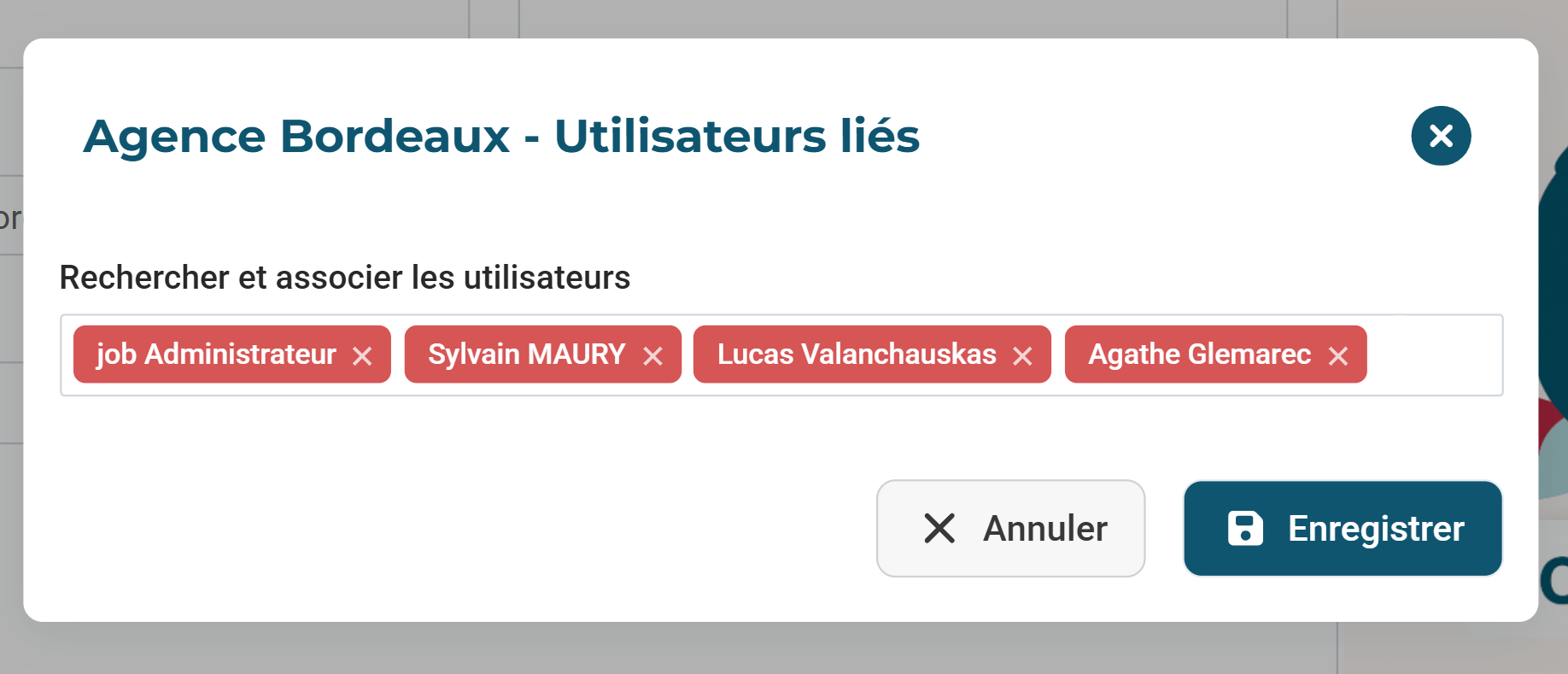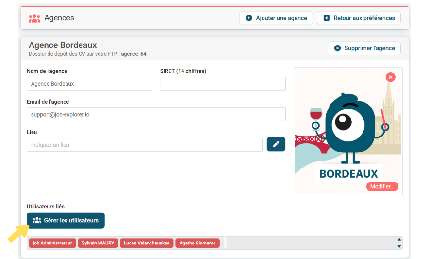 Vous retrouverez vos différentes agences ainsi que les utilisateurs qui la compose. En cliquant sur "Gérer les utilisateurs"