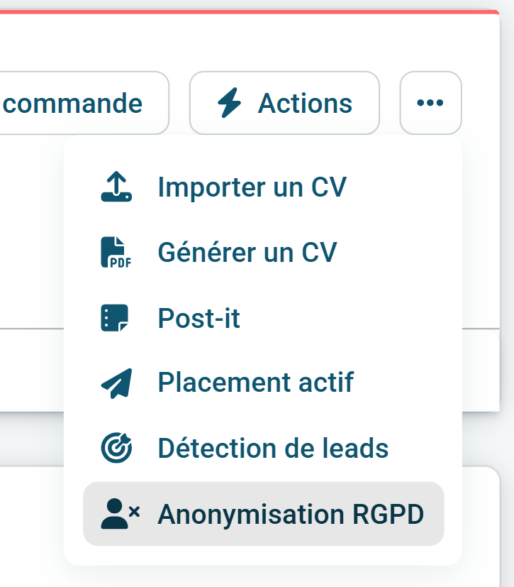 Pour effectuer cette action, il faut vous rendre sur une fiche candidat puis en haut à droite de cette fiche se situe un bouton "Plus" qui permet de dérouler un listing de diverses actions.