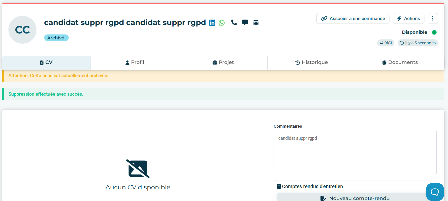 La suppression RGPD d’un candidat est une action réservée aux administrateurs.