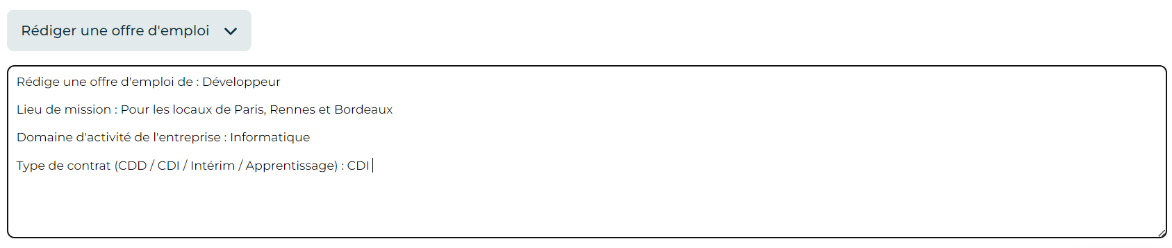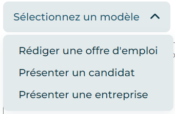 Vous avez la possibilité de composer votre propre demande dans le bloc dédié, mais nous vous proposons également certains prompts intéressant à compléter dans "Sélectionnez un modèle" :