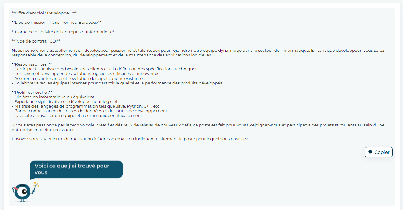 Votre assistant IA est conçu pour être votre partenaire dans le processus de gestion des talents. Il est là pour simplifier vos tâches, accroître votre productivité, vous offrir des solutions intelligentes et vous aider à prendre des décisions éclairées.💡