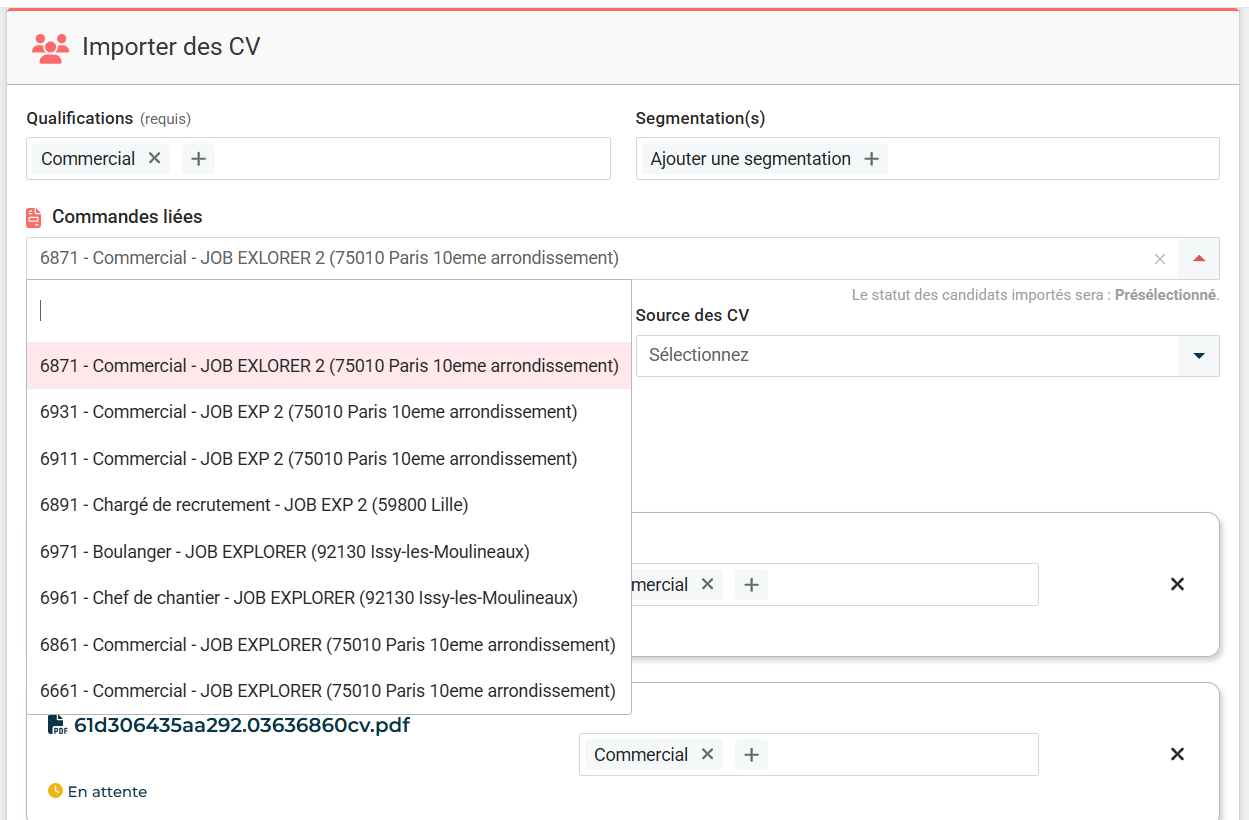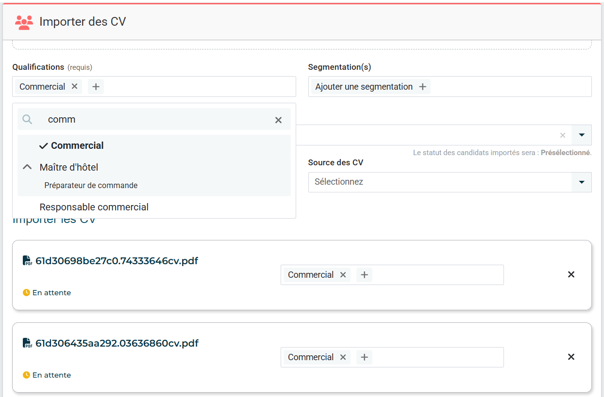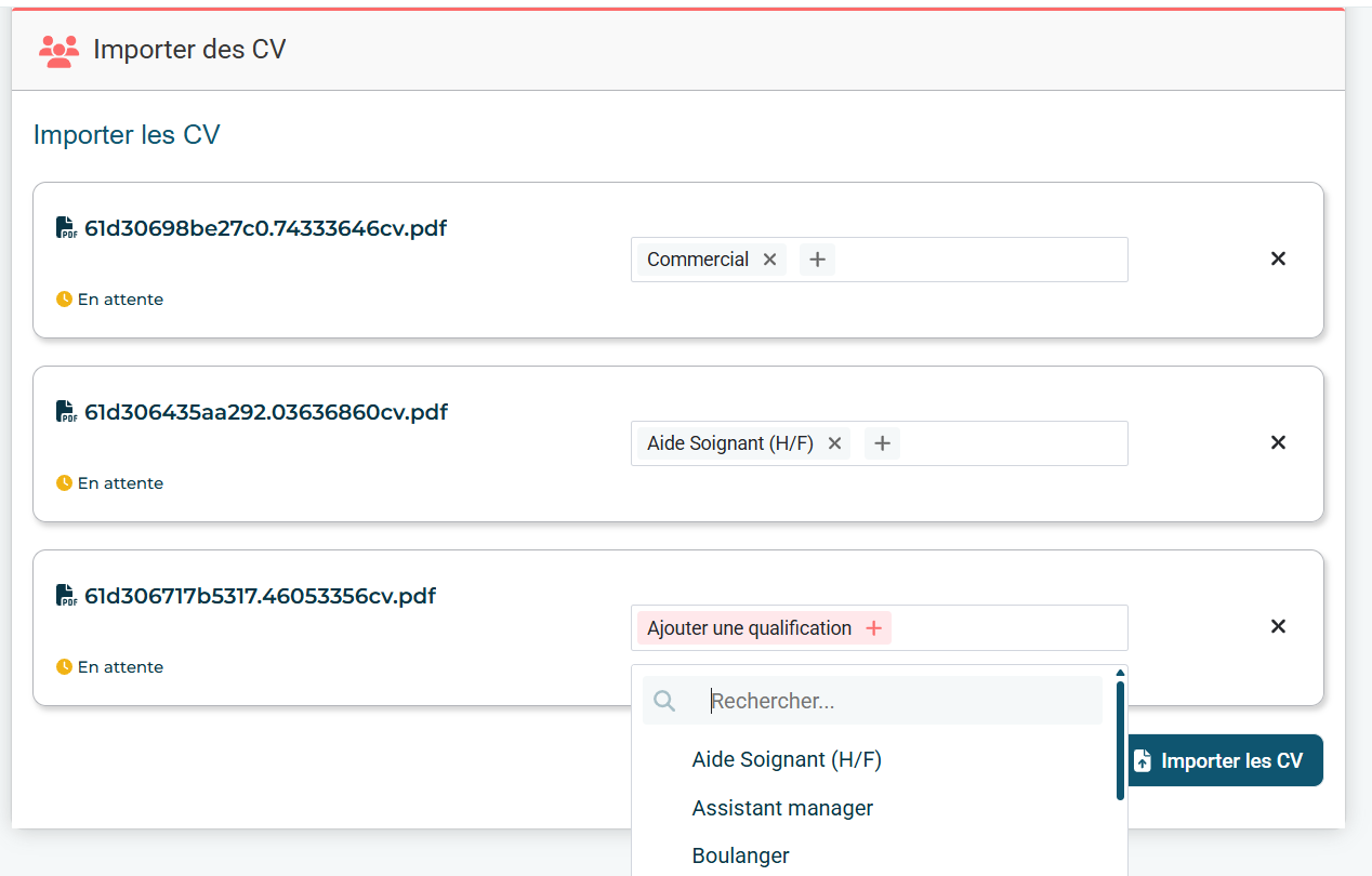 - Si vous importez des CV correspondant à différents métiers, vous pourrez sélectionner la qualification individuellement pour chaque candidat.