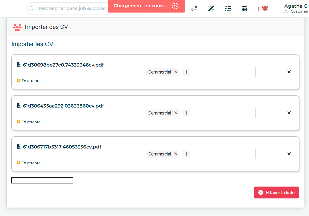 - Si vous importez un lot de CV avec tous la mĂȘme qualification, vous pouvez la renseigner directement via le champ "Qualifications" situĂ© Ă gauche.