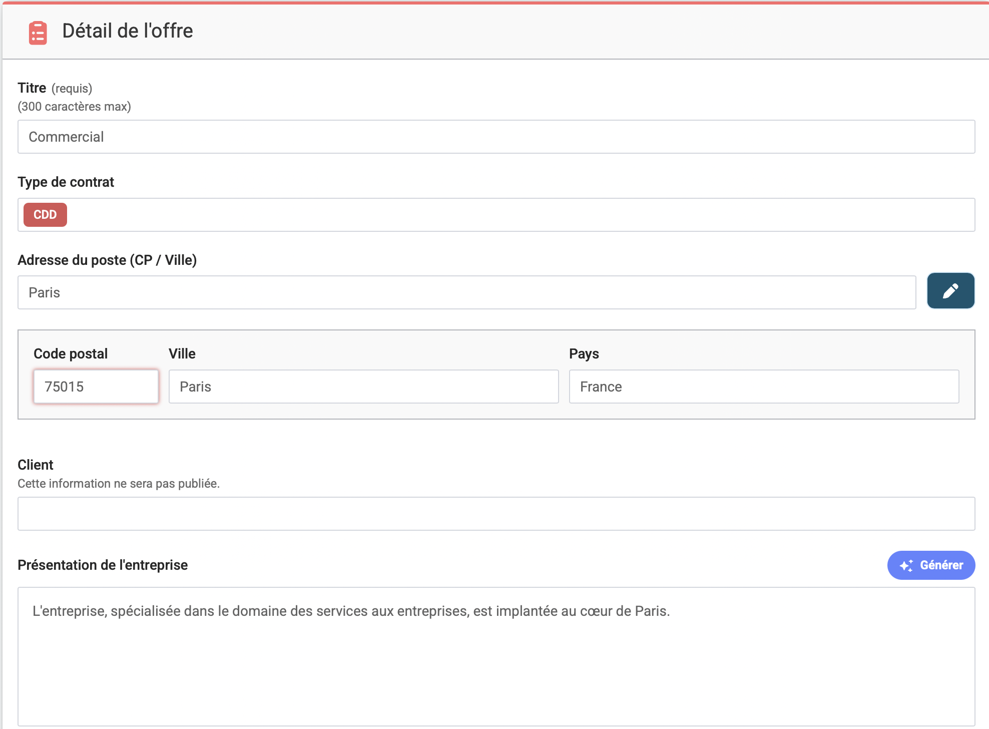 Vous pouvez ensuite compléter les détails de l’offre (description du poste, profil recherché, qualifications, rémunération, etc.), définir la date de publication souhaitée ou utiliser l’assistance IA 🪄pour générer certains contenus à partir des informations déjà renseignées.