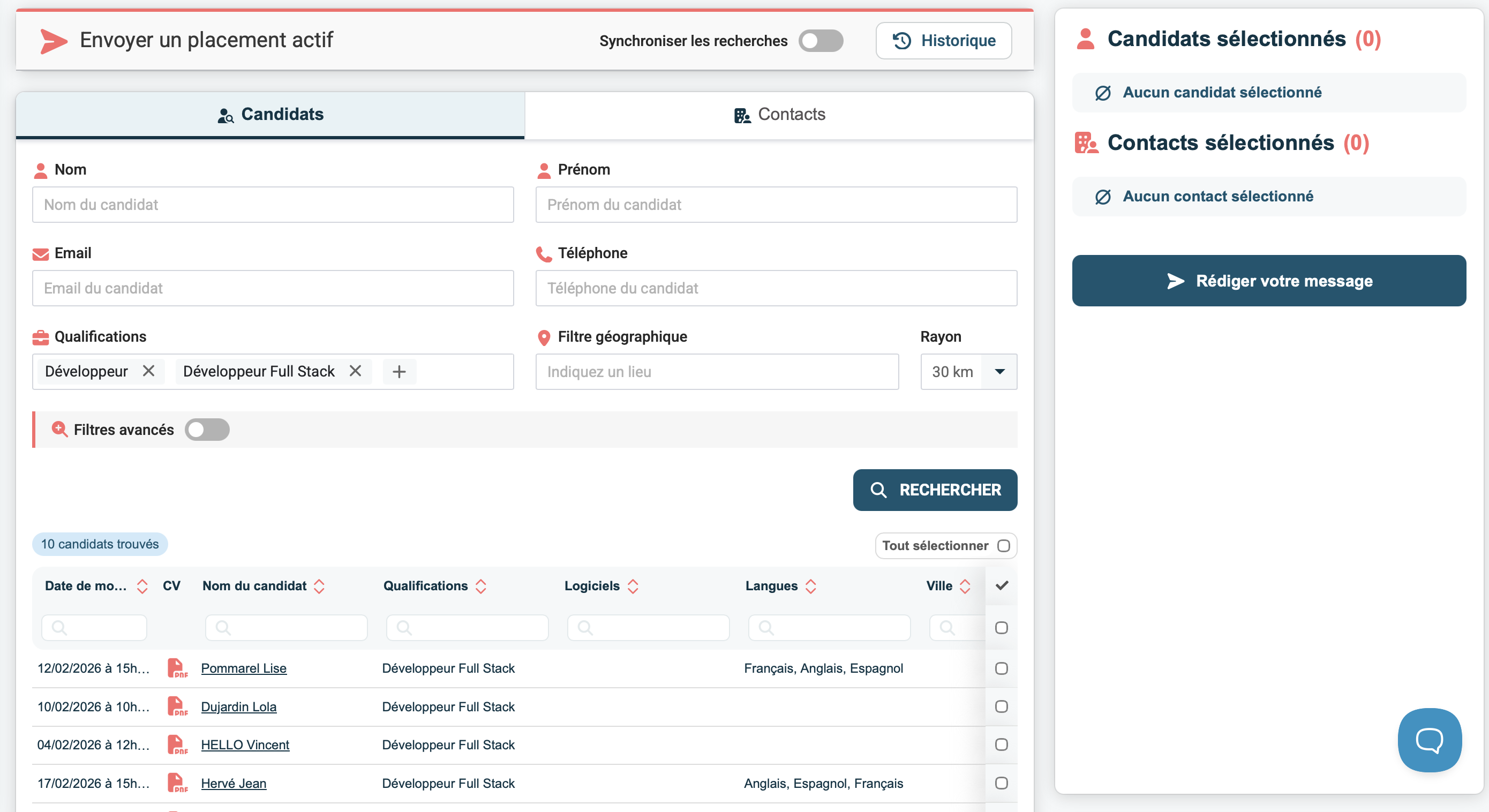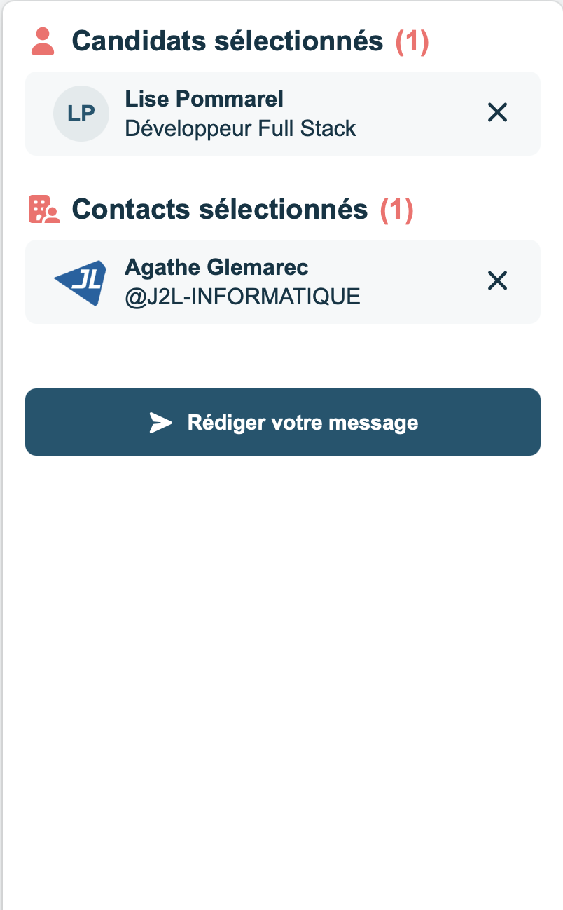 Une fois vos candidats et contacts sélectionnés, ceux-ci apparaissent dans le panneau situé à droite de l’écran.