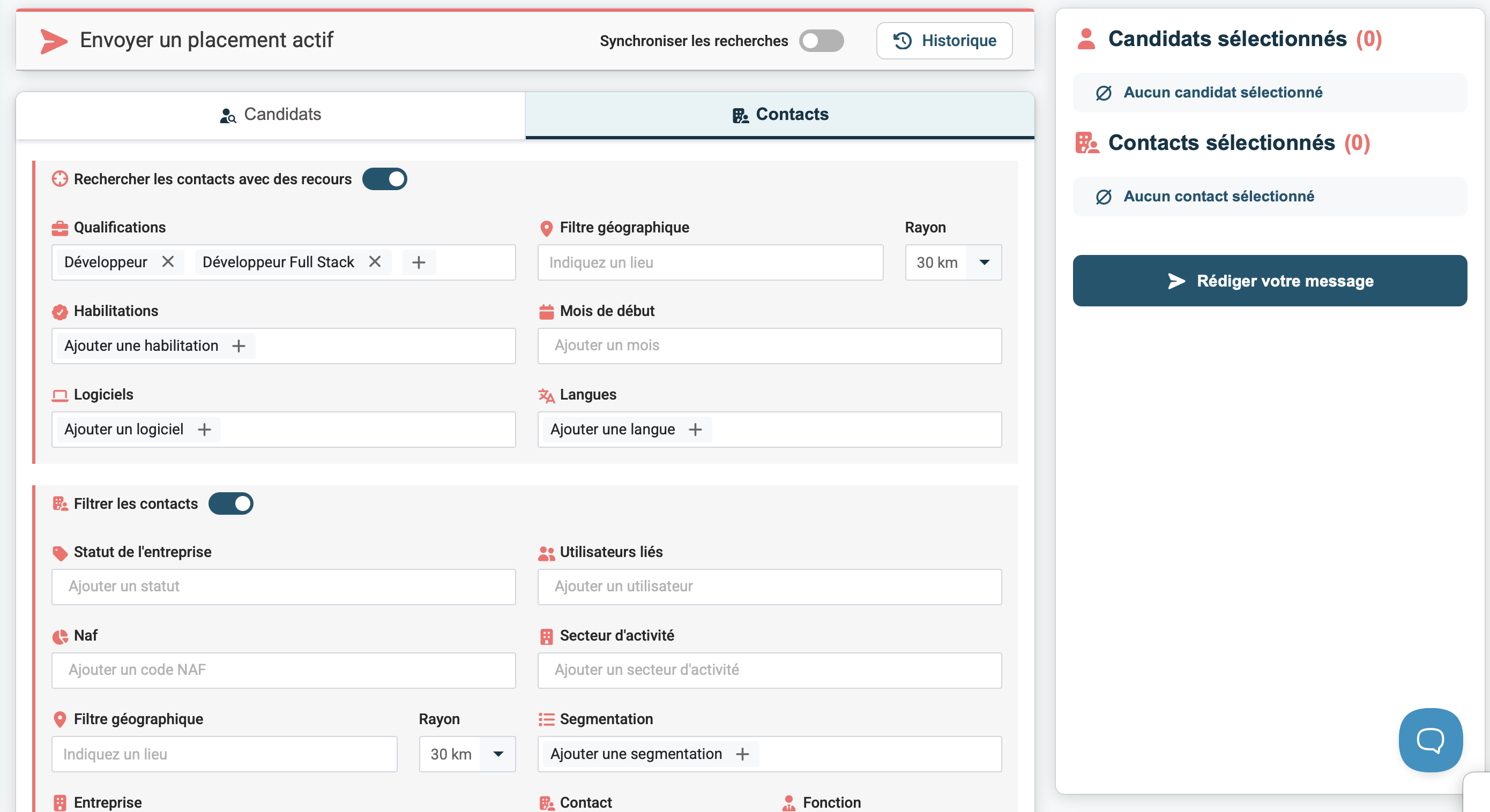 Un onglet « Contacts » permet d’identifier les entreprises et interlocuteurs pertinents à associer à vos candidats, grâce à différents filtres (secteur, localisation, qualifications, segmentation…).