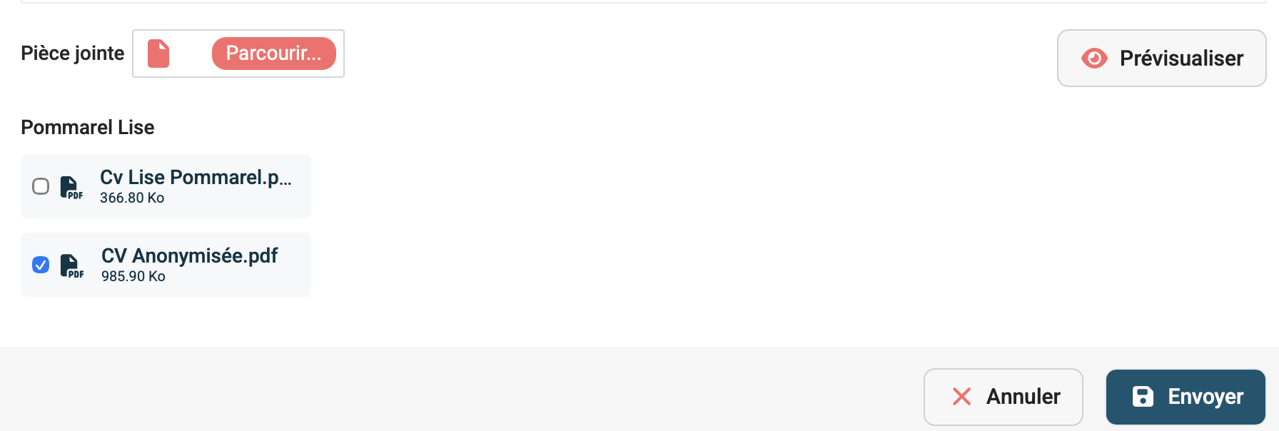 Ensuite, cochez la case située sous le CV correspondant à la pièce jointe que vous souhaitez envoyer en l'occurrence sélectionné le CV Anonymisée. (peut-être dire que les fichiers trop lourds ne passeront pas.? )
