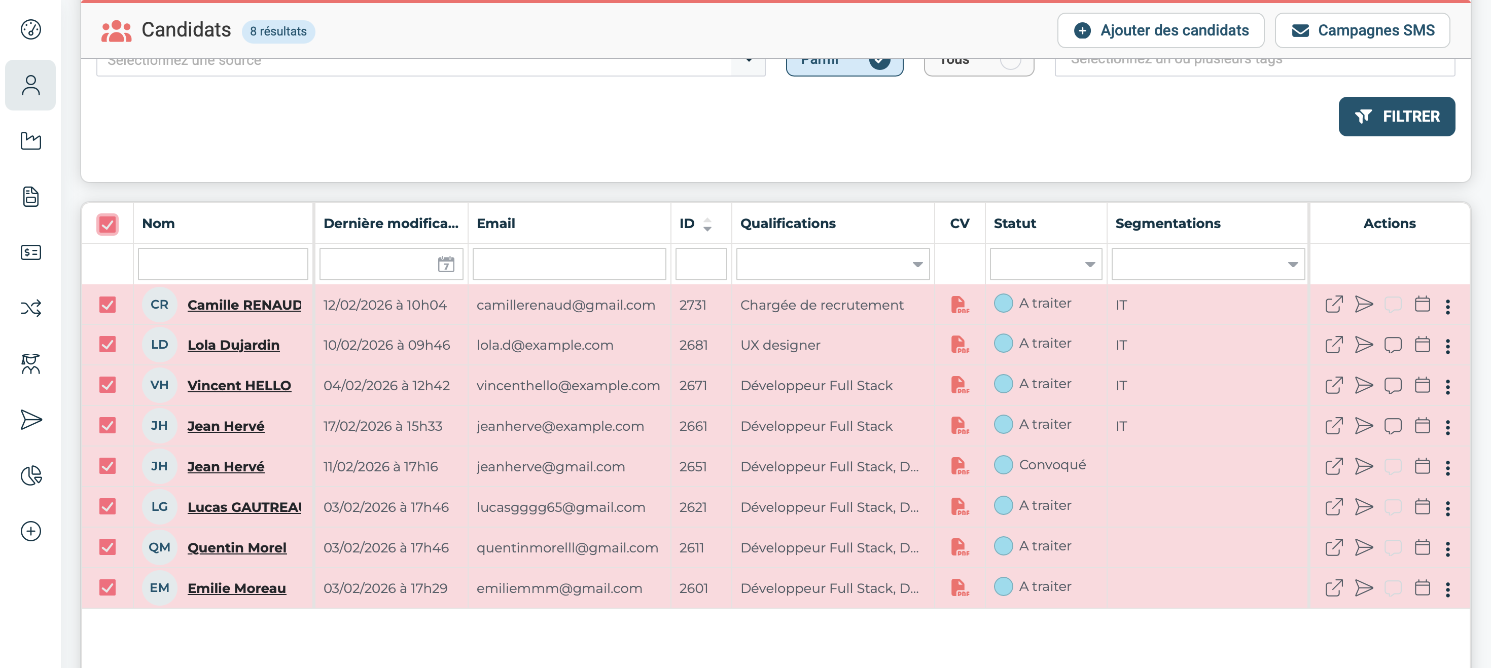Vous avez la possibilitĂ© de rechercher des candidats spĂ©cifiques Ă lâaide des filtres disponibles (nom, statut, qualification, etc.), ou de sĂ©lectionner directement un ou plusieurs candidats depuis le tableau de rĂ©sultats.