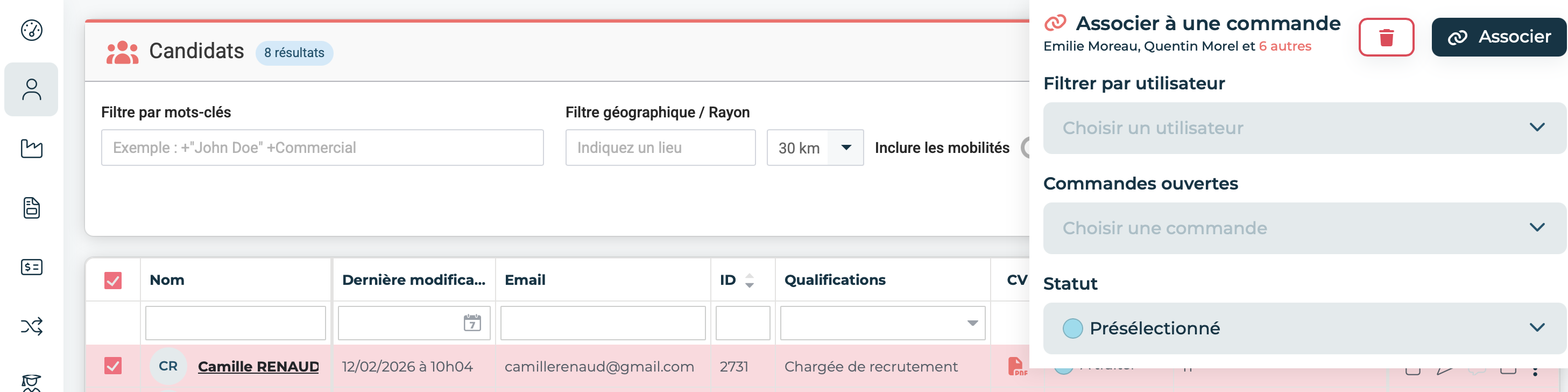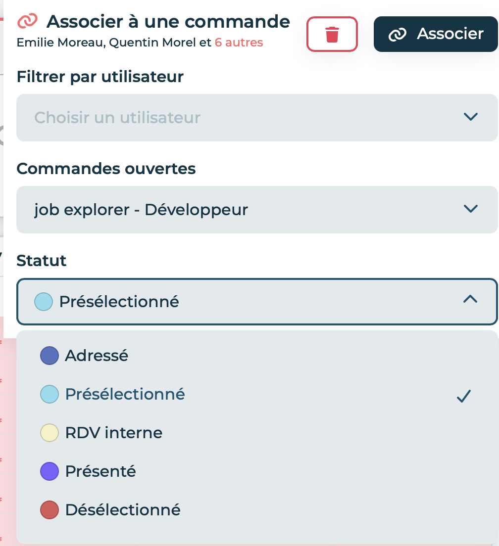 Cliquez sur Associer pour valider lâaction â . Les candidats sont immĂ©diatement rattachĂ©s Ă la commande avec le statut choisi.