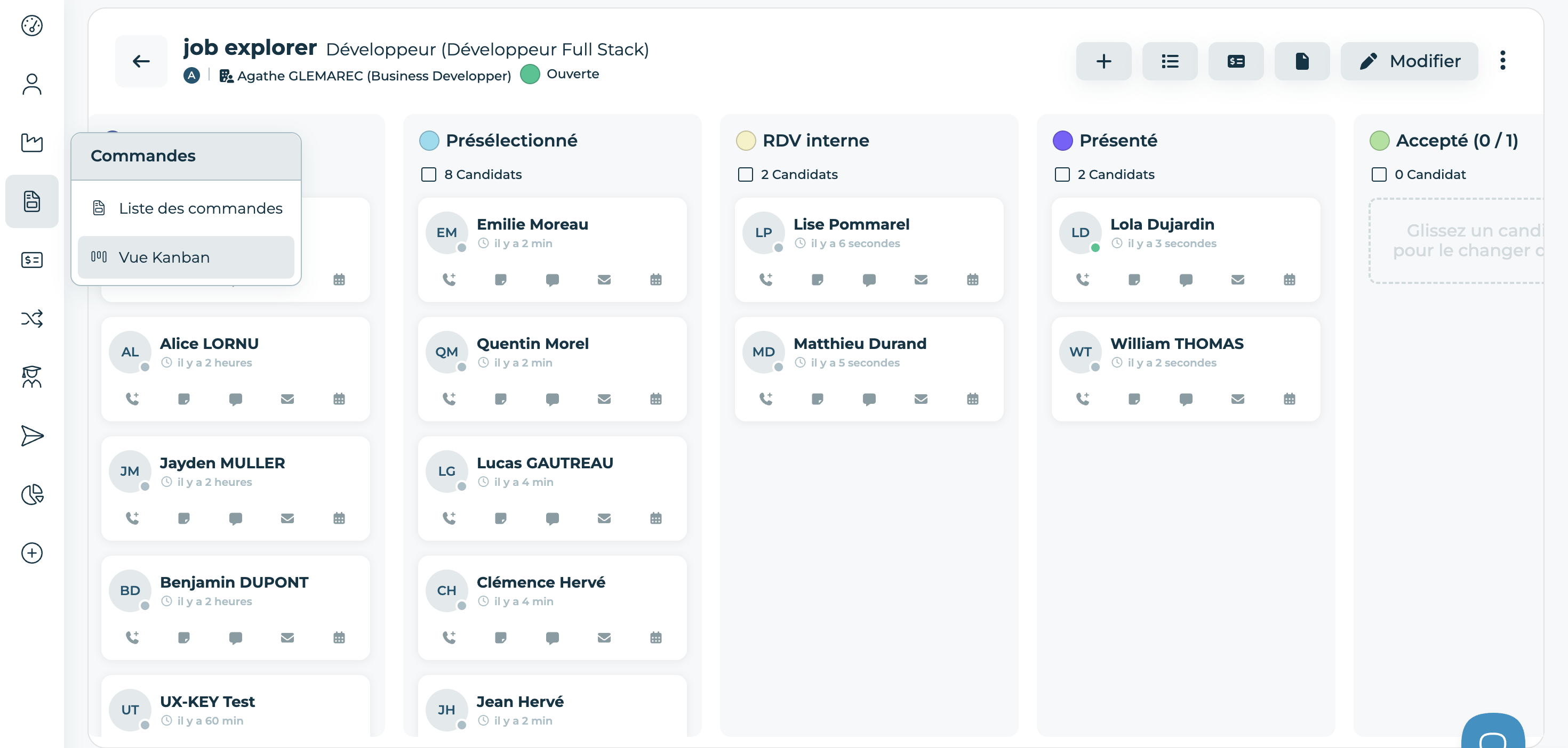 SĂ©lectionnez ensuite la commande sur laquelle vous souhaitez positionner le ou les candidats, puis dĂ©finissez le statut associĂ© Ă leur candidature đ (AdressĂ©, PrĂ©sĂ©lectionnĂ©, Rendez-vous Ă terme, PrĂ©sentĂ© ou DĂ©sĂ©lectionnĂ©).