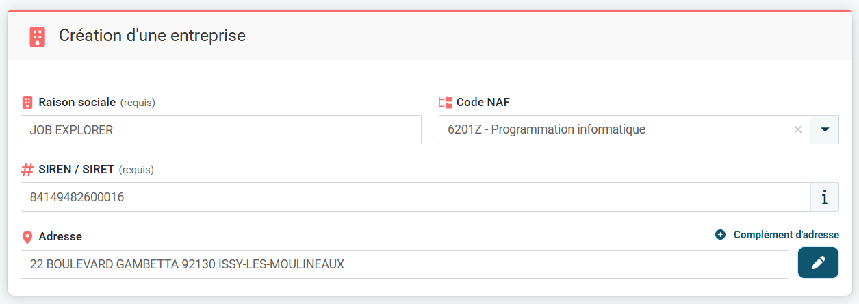 La fiche entreprise s'affiche alors en mode édition et vous pouvez commencer votre saisie. ✍️