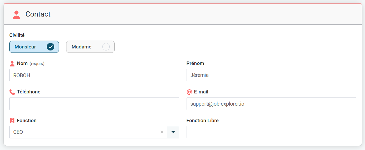 Si le contact n'est pas encore identifié, pas d'inquiétude : vous pouvez temporairement laisser le terme "DRH" dans le champ "Nom" pour créer un contact par défaut et finaliser la fiche entreprise, en attendant de disposer des informations précises à compléter au sujet du contact. 😉
