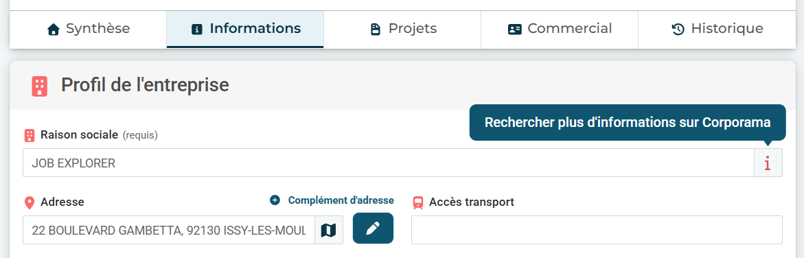 Votre logiciel vous dirige alors automatiquement vers la page de votre nouvelle fiche entreprise. 👀Elle comporte désormais davantage de champs et des onglets dans lesquels vous pouvez ajouter plus d'informations à son sujet. ✍️