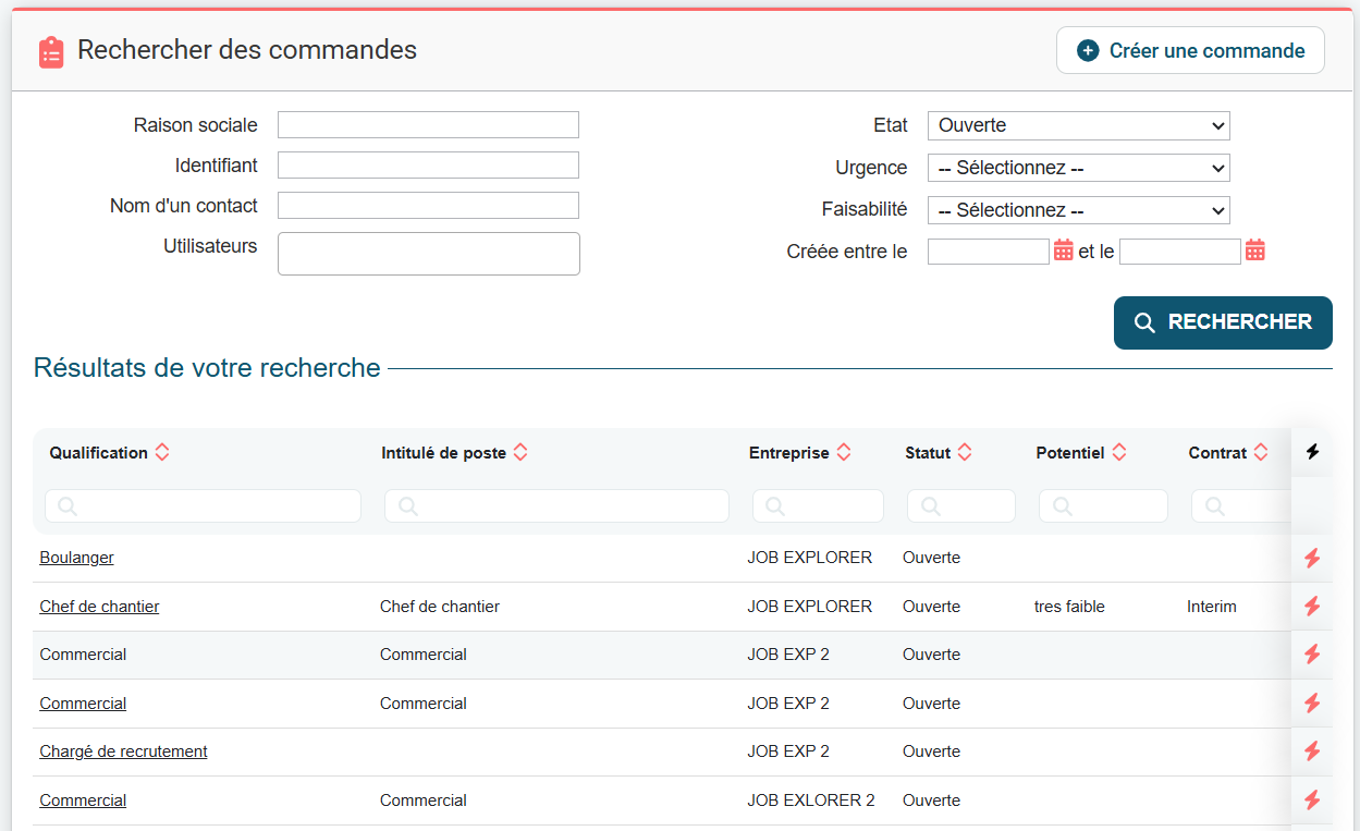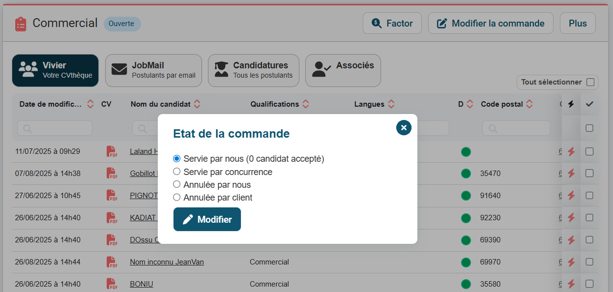 Attention, si vous choisissez "Servie par <nom de votre entreprise>" ou "Servie par nous", vous n'aurez pas nécessairement accepté un candidat sur la commande et cette commande sera indiquée comme servie alors qu'aucun candidat n'est associé !