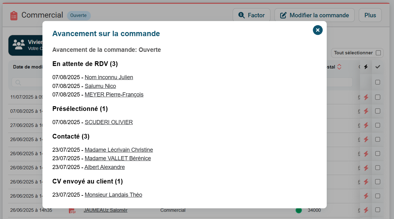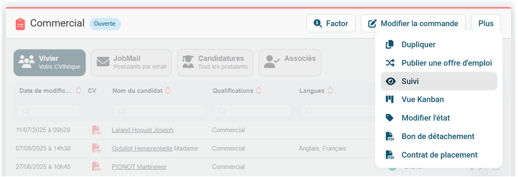 À tout moment, vous pouvez consulter l’avancement d’une mission en cliquant sur le bouton Suivi, situé en haut de la fiche de commande. Vous accéderez ainsi à une vue chronologique des différents statuts et des candidats associés à la commande concernée.