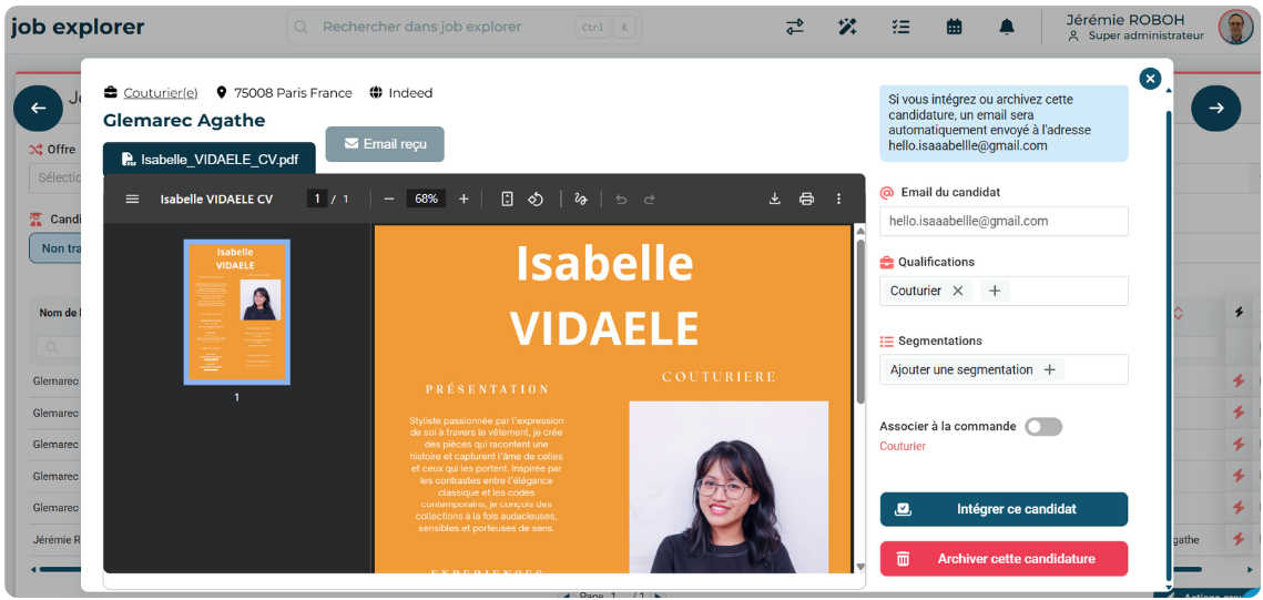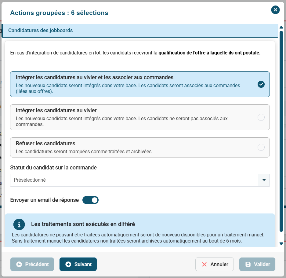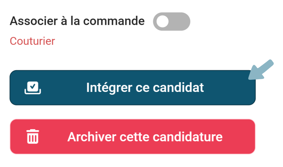 L'intégration de la candidature créera une fiche candidat et positionnera le candidat au statut que vous aurez choisit sur la mission correspondante (🚨à condition que l'offre soit reliée à une mission / commande créée pour un client).
